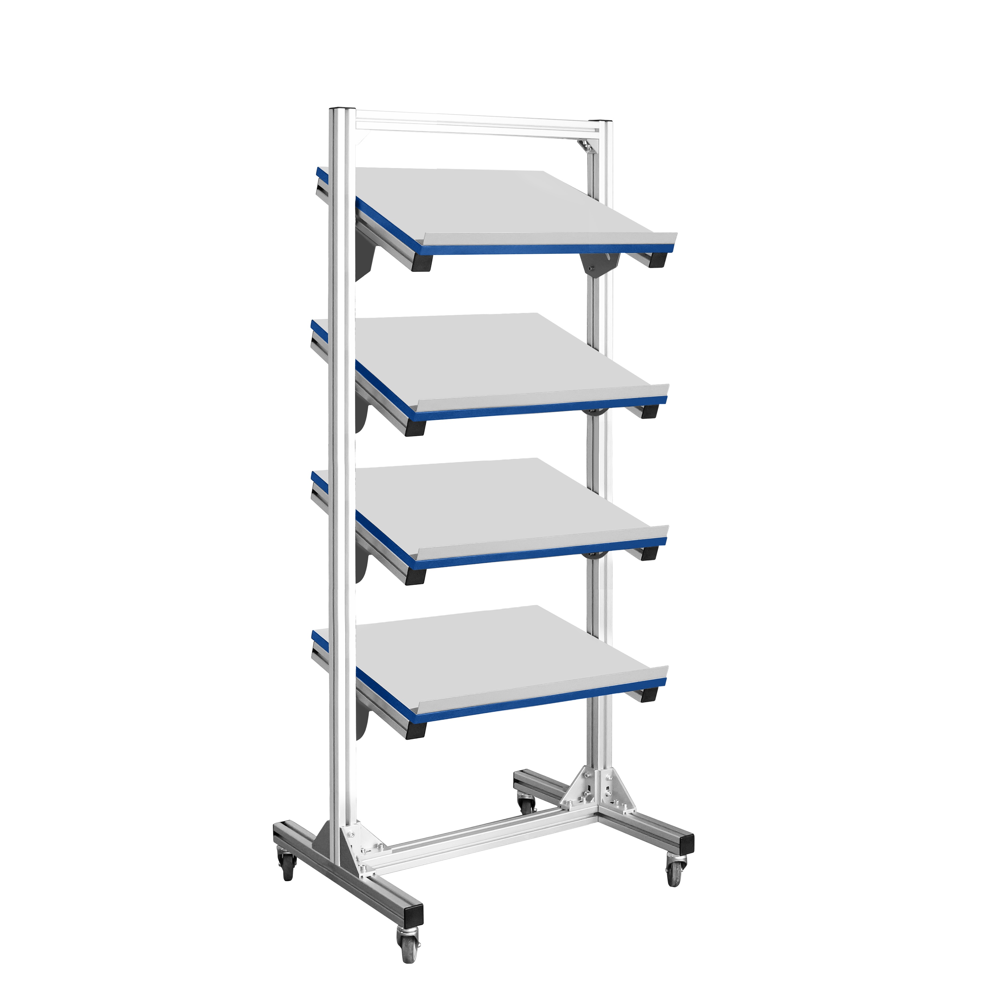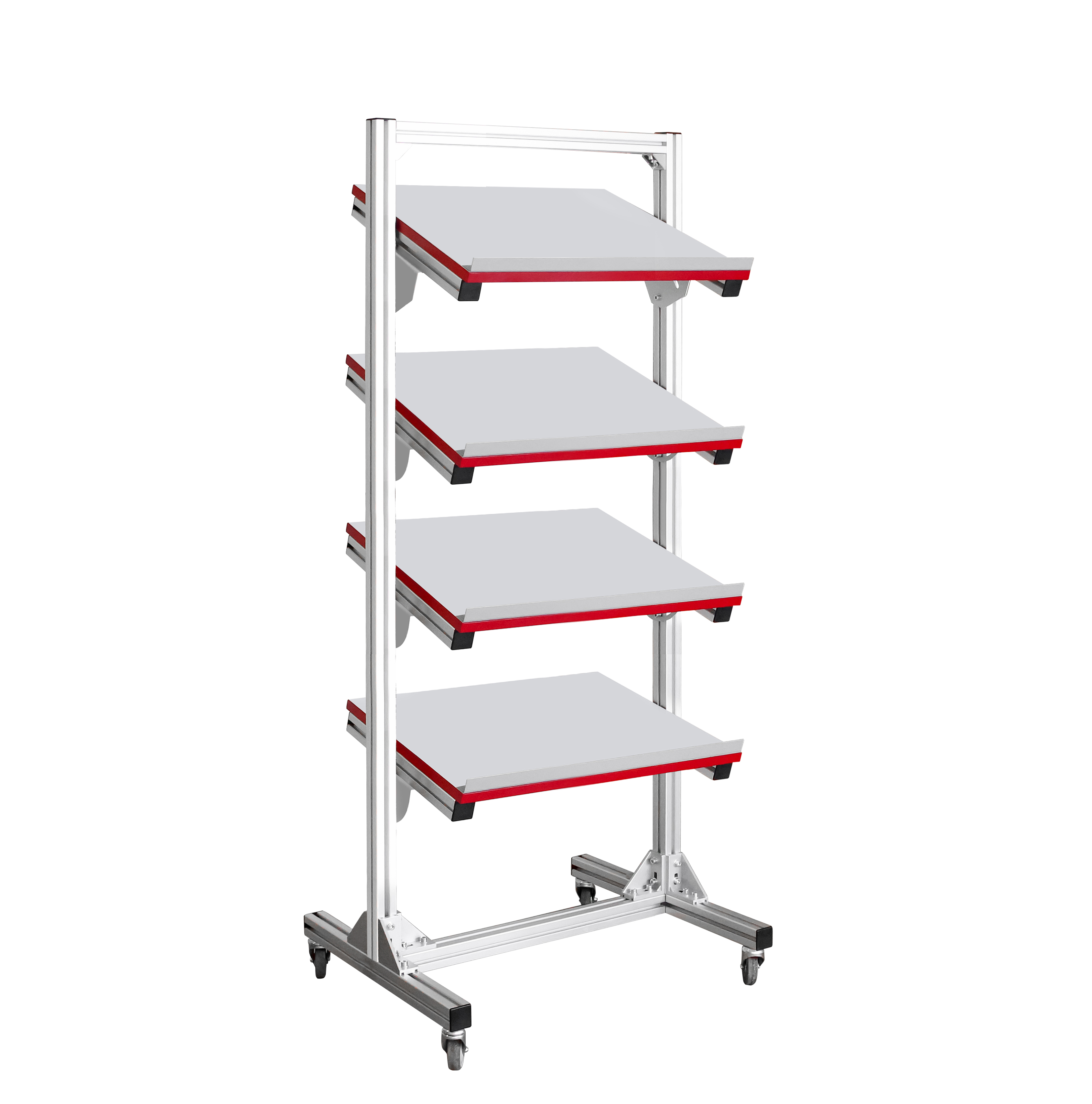 • Четыре наклонные полки с регулировкой по высоте и углу наклона оснащены упорами от скатывания.