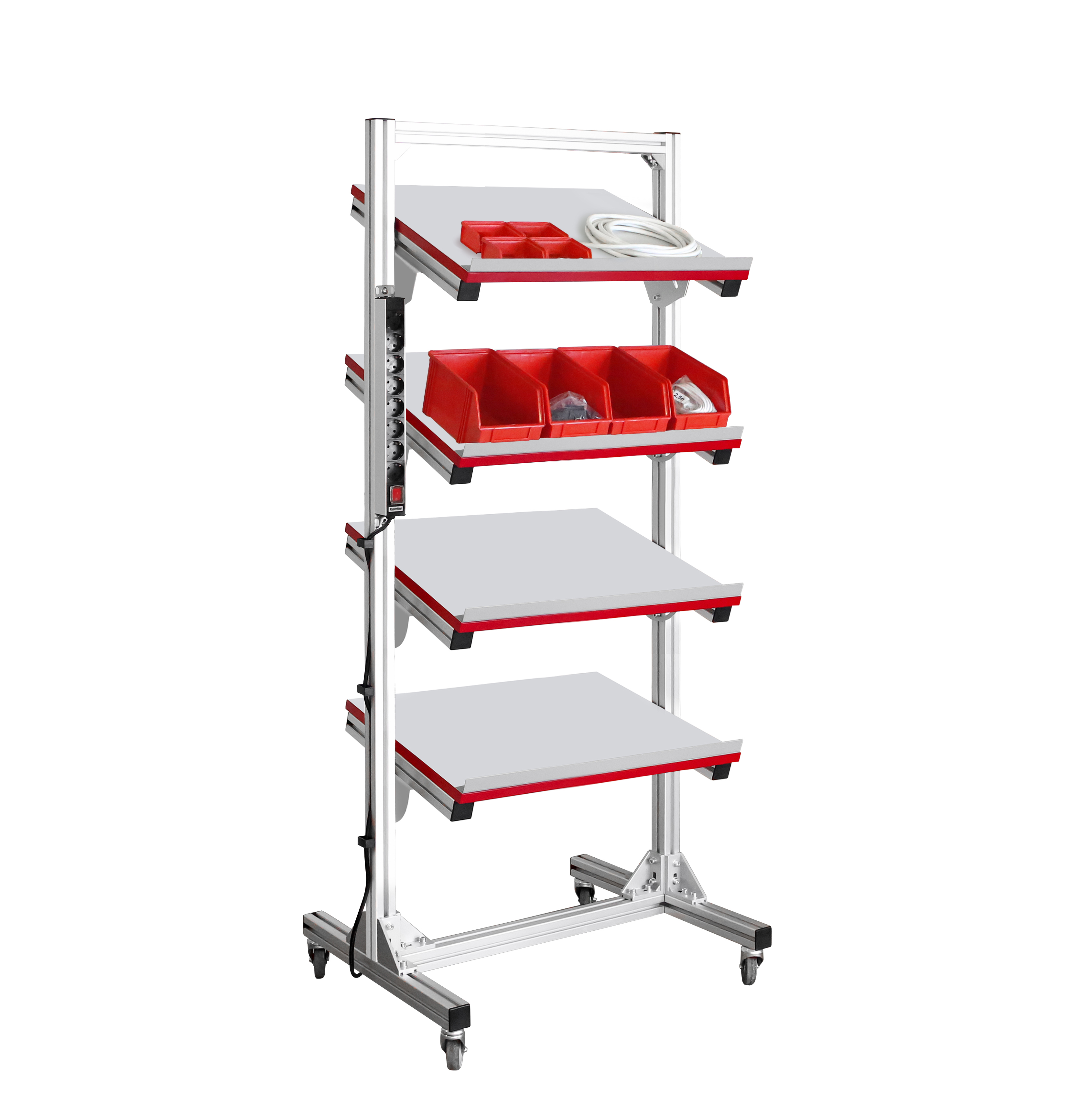 Стойка подкатная из конструкционного профиля СНП-КП предназначена для размещения приборов и контейнеров для компонентов, а также их дальнейшего перемещения в рабочей зоне. Стойка оснащена четырьмя наклонными полками с упорами от скатывания, которые раздельно регулируются по высоте и углу наклона. Высота стойки — 1700 мм., ширина полок — 595 мм., глубина полок — 500 мм. Имеются четыре колесные опоры, две из которых с механизмом фиксации. Конструкция позволяет оснастить стойку дополнительными полками и электропанелью на 6, 8, 12 розеток.