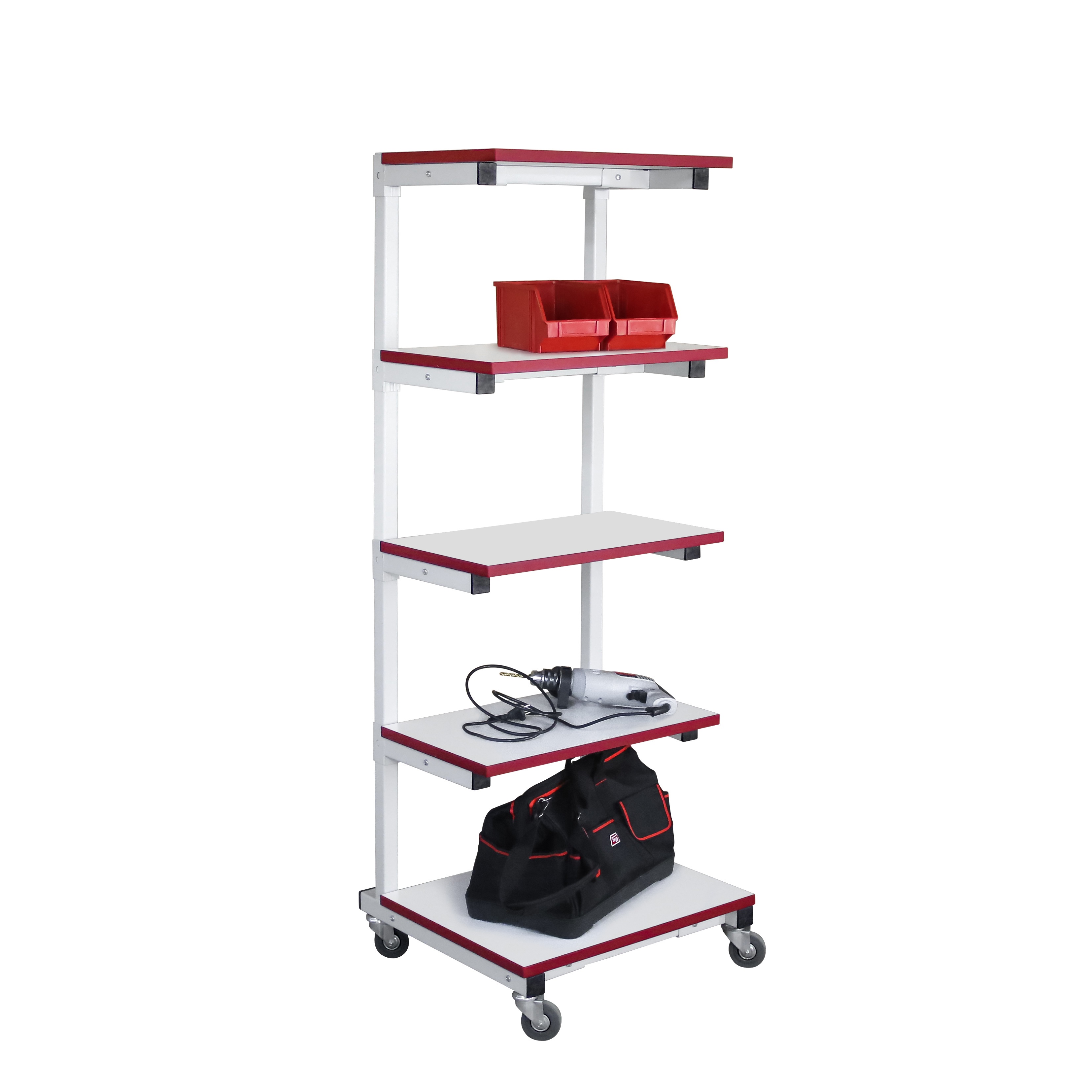 Стойка антистатическая, согласно требованиям стандарта ГОСТ IEC 61340-5-1-2019, на лицевой стороне имеет маркировку ESD — знак ESD (Electrostatic sensitive device), обозначающий работу с материалами, чувствительными к электростатическому разряду. В комплект поставки антистатической стойки входит набор ESD колес и набор для заземления полок — болт и провод с клеммой.