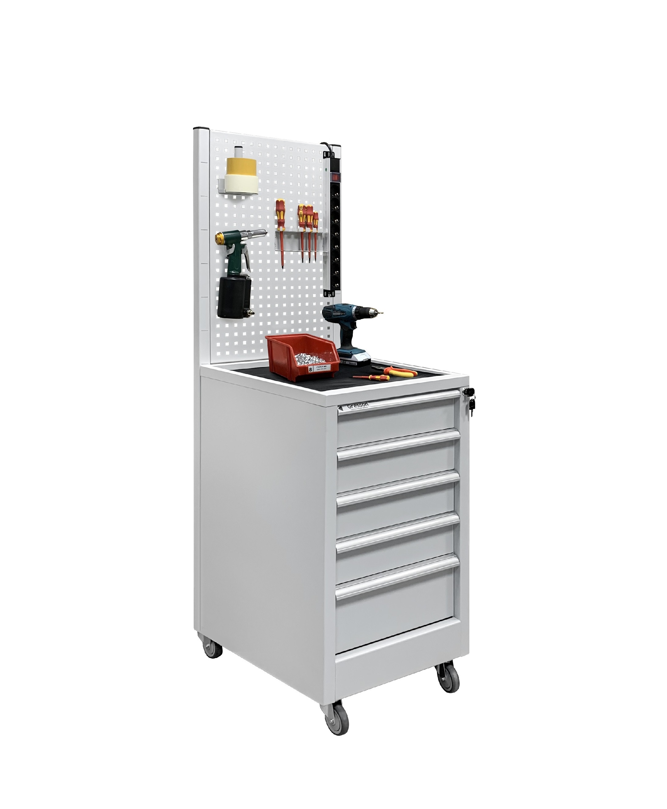 Стойка оснащена центральным замком для индивидуального доступа. Каркас и ящики изготовлены из листового металла для увеличения эксплуатационного ресурса и повышения надежности. Ящики защищают рабочие материалы, инструменты от загрязнения и сохраняют их в исходном состоянии. Ручки изготовлены из алюминиевого профиля с анодированным покрытием и боковыми пазами для установки обозначения (маркировки) ящиков по их прямому назначению (подразделение организации, документация, инструменты, материалы и т.д.).