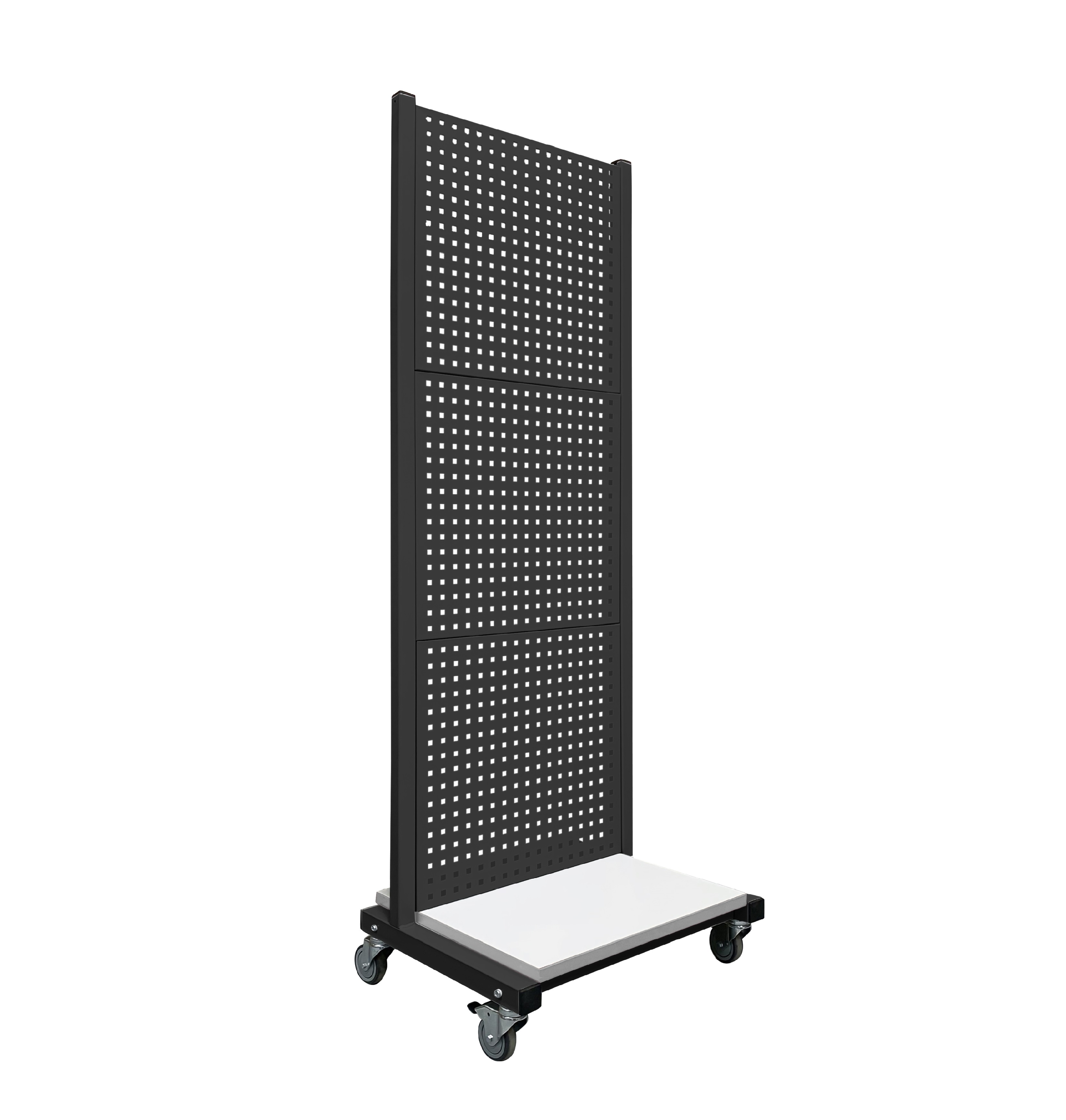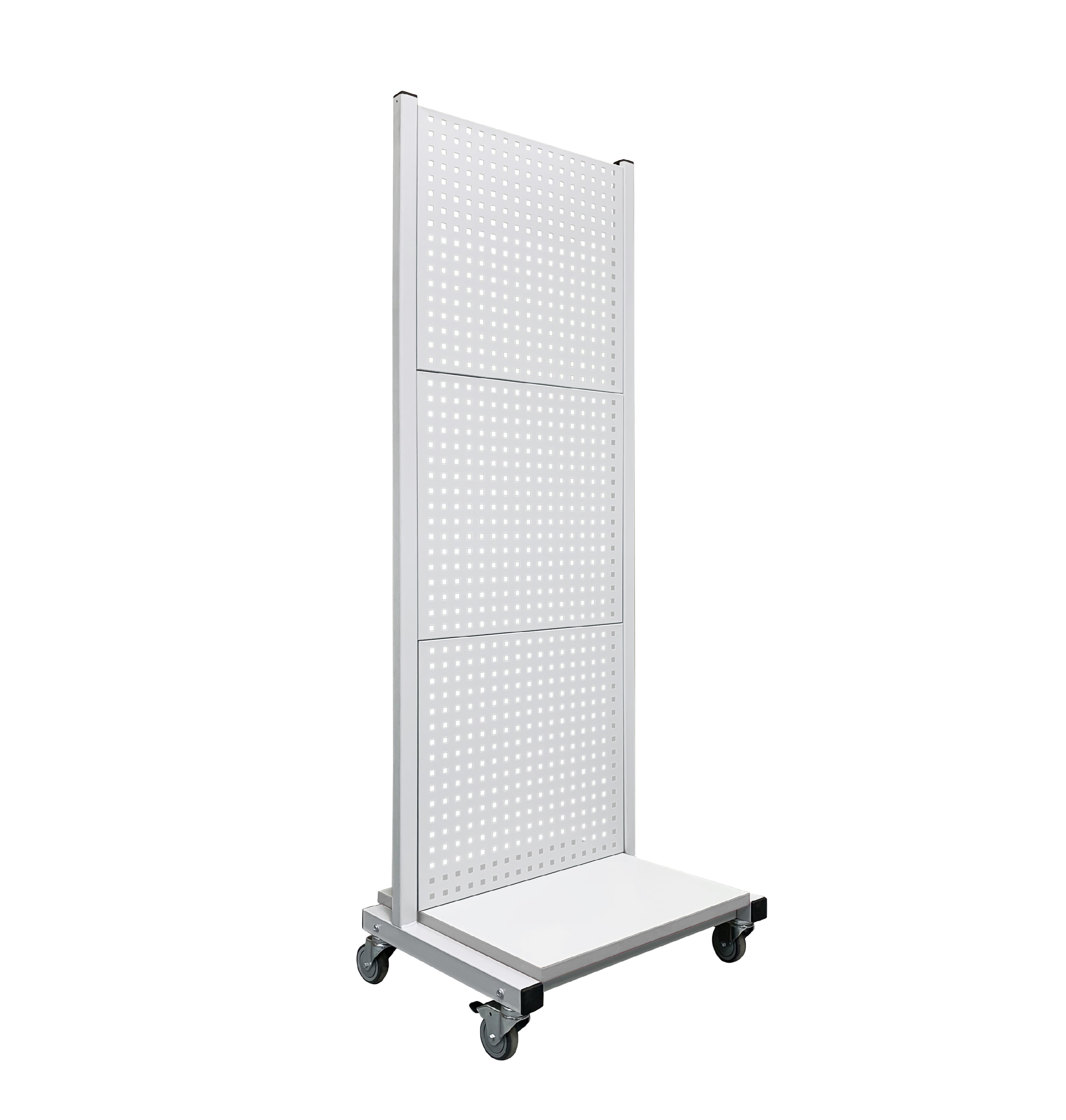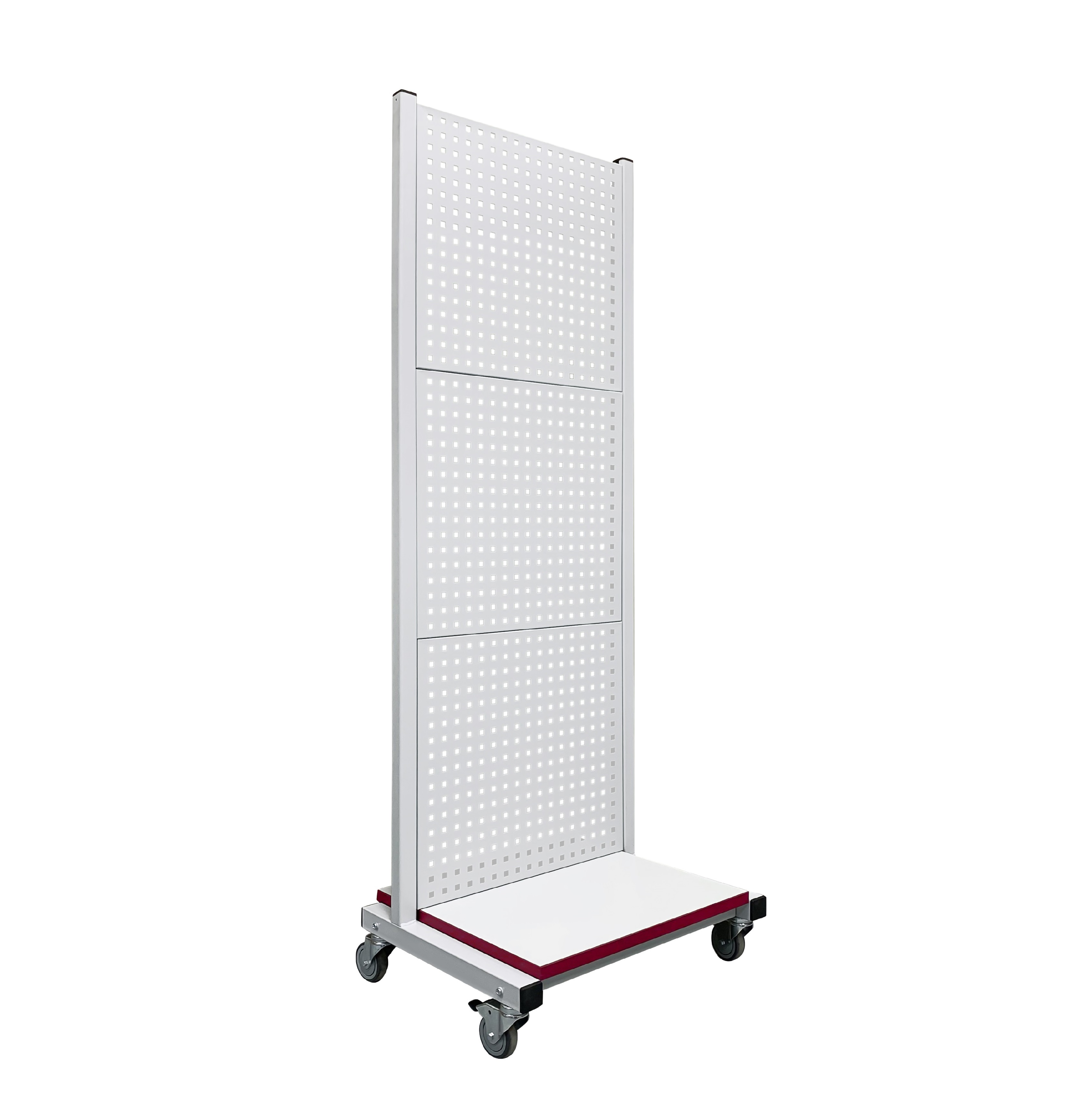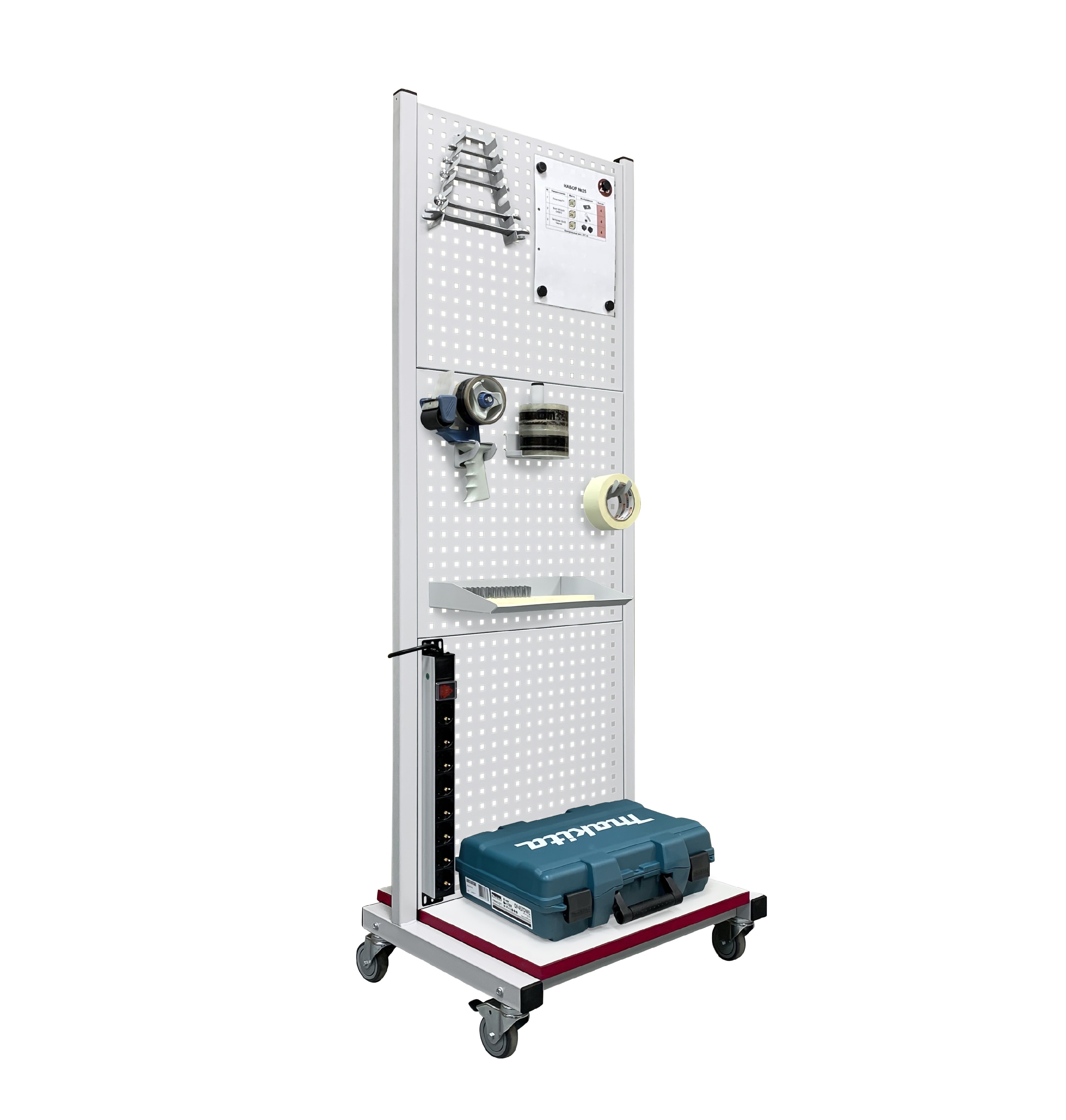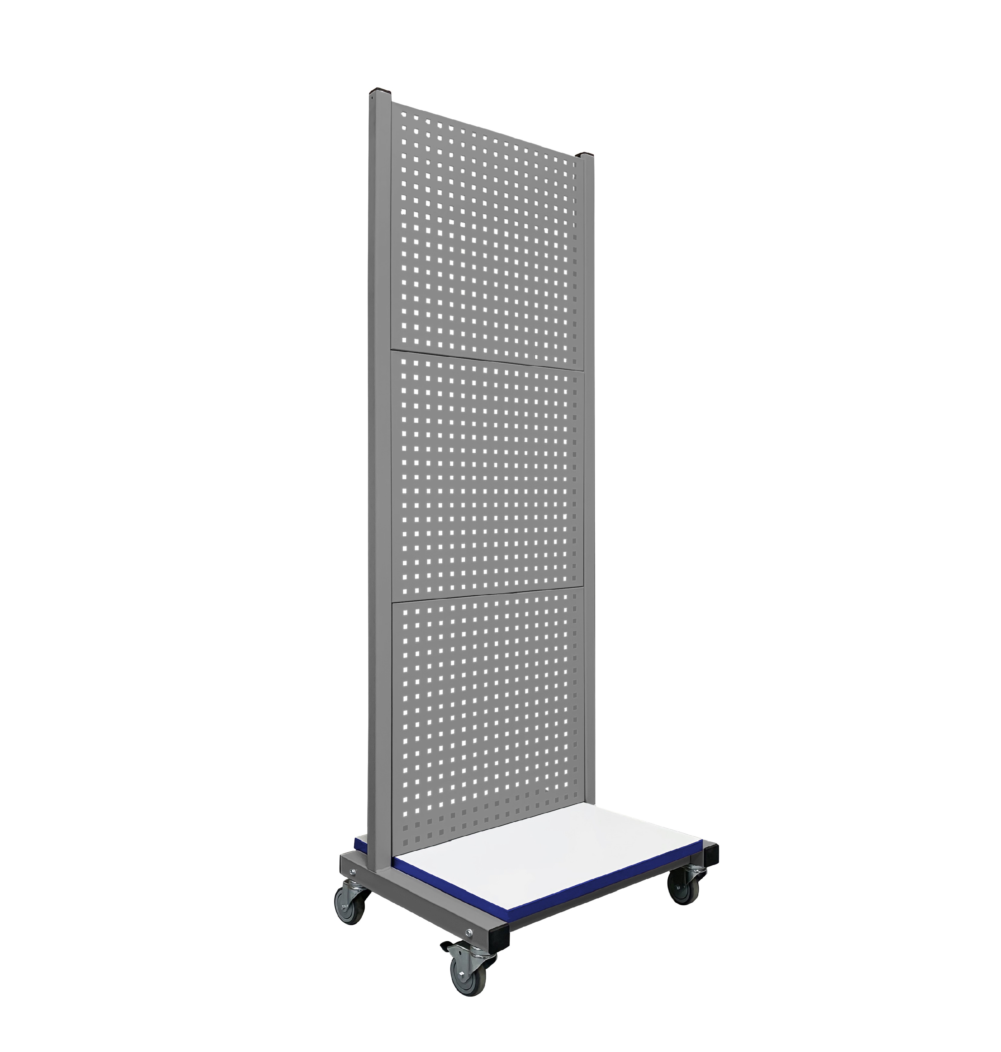 Стойка подкатная универсальная СПФ используется для хранения и перемещения инструментов, материалов и комплектующих в рабочем пространстве. С помощью крючков для инструментов КР на подкатной стойке возможно разместить различный инструмент: отвертки, пинцеты, сверла, гаечные и шестигранные ключи, пассатижи, молотки и киянки, канцелярские принадлежности и другой ручной слесарно-монтажный инструмент. В стандартной комплектации стойка поставляется в комплекте с панелью перфорированной ППМ (3 шт.). Возможно зеркальное (двухстороннее) размещение перфопанелей. Крючки для инструмента возможно подобрать в разделе «Дополнительное оснащение рабочих мест». Стойка мобильная имеет металлический каркас, окрашенный порошковой краской.