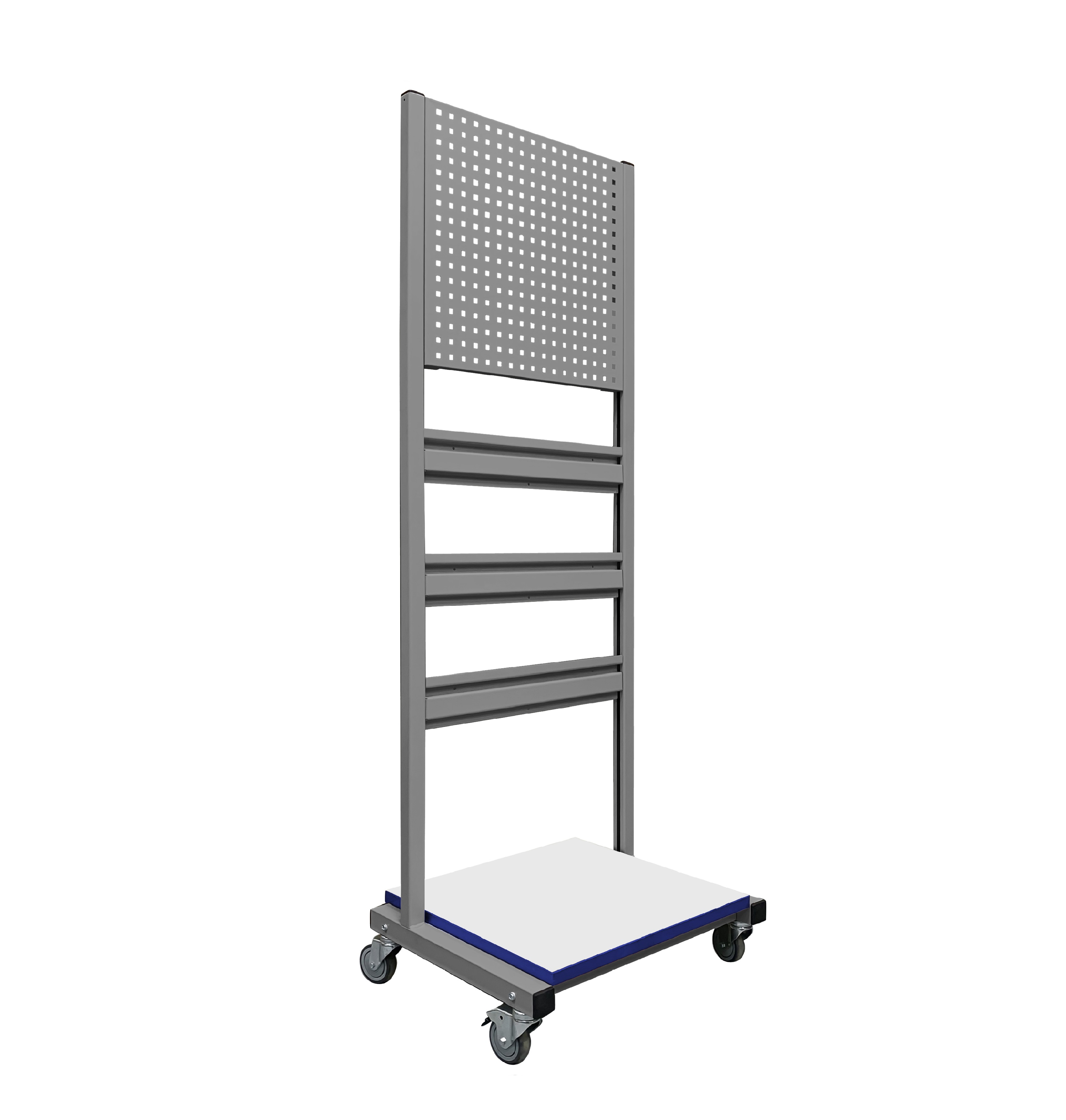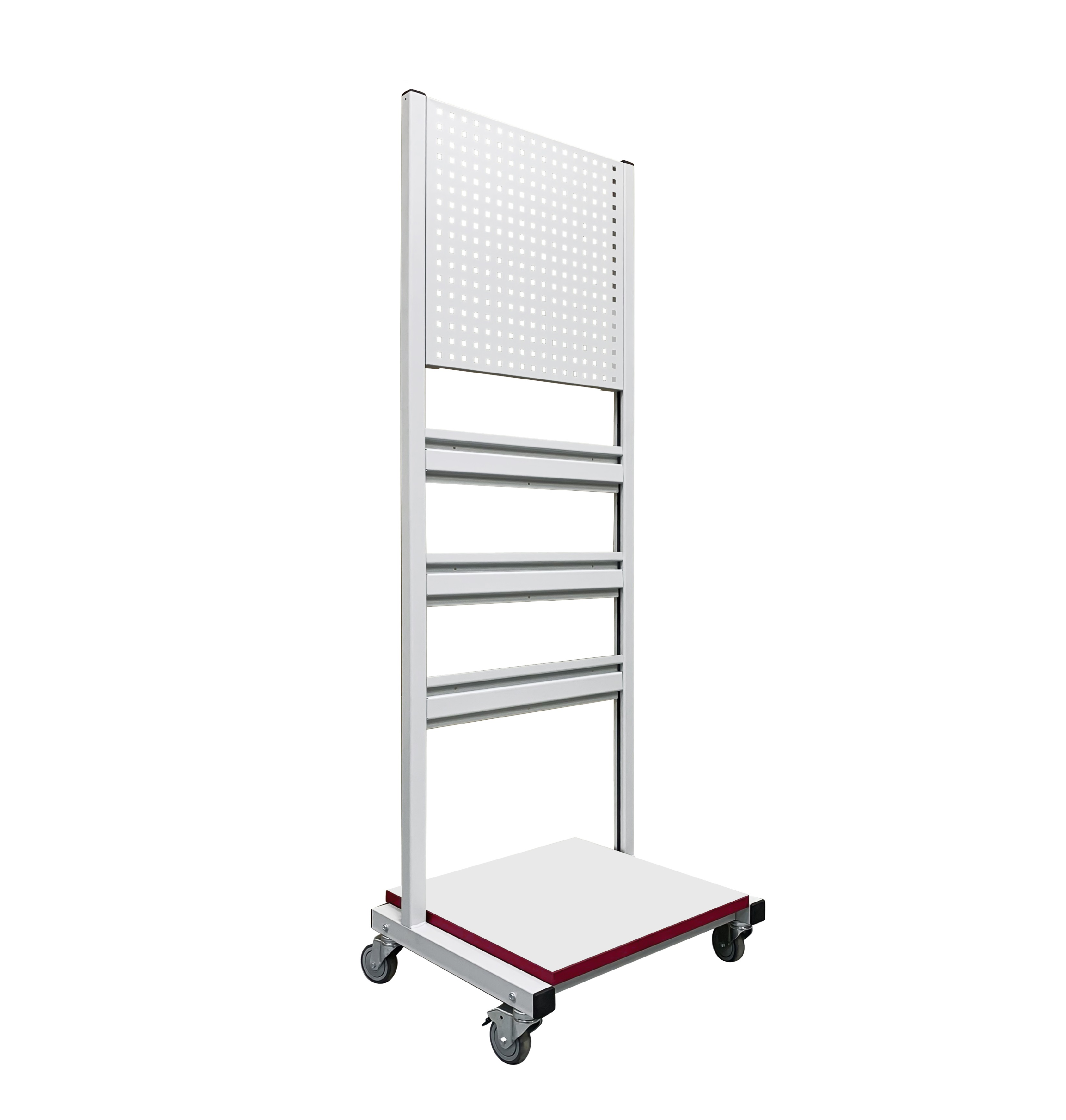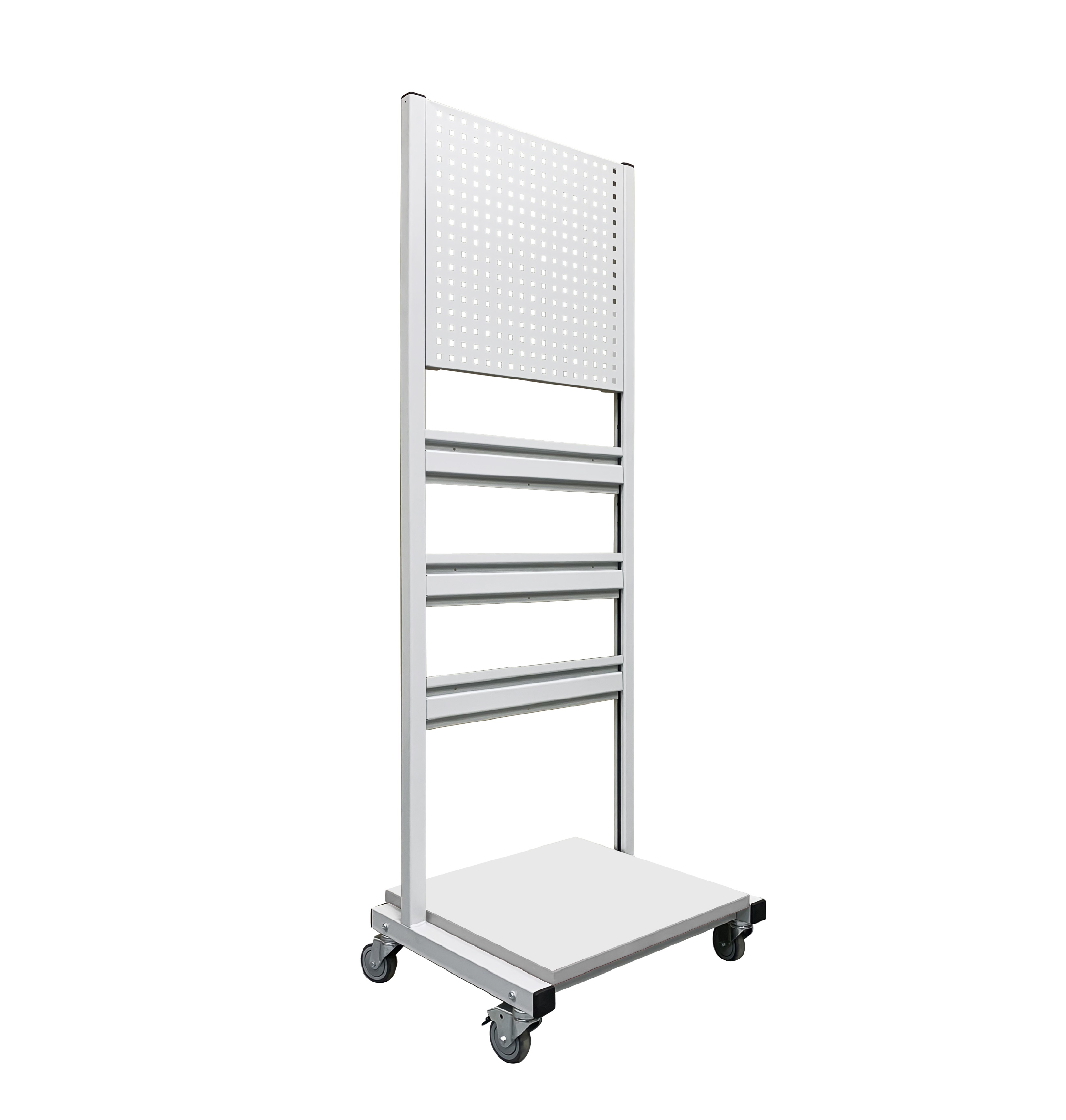 Стойка подкатная универсальная СПК используется для хранения и перемещения инструментов, материалов и комплектующих в рабочем пространстве. В стандартной комплектации стойка поставляется в комплекте с панелью перфорированной ППМ и планкой для лотков ПЛМ (3 шт.). Возможно зеркальное (двухстороннее) размещение планок для лотков и перфопанелей. Регулировка высоты дополнительного оборудования осуществляется по боковым стойкам. Конструкция стойки позволяет оснастить ее дополнительным оборудованием — полками, перфопанелями и планками для лотков. Стойка мобильная имеет металлический каркас окрашенный порошковой краской.