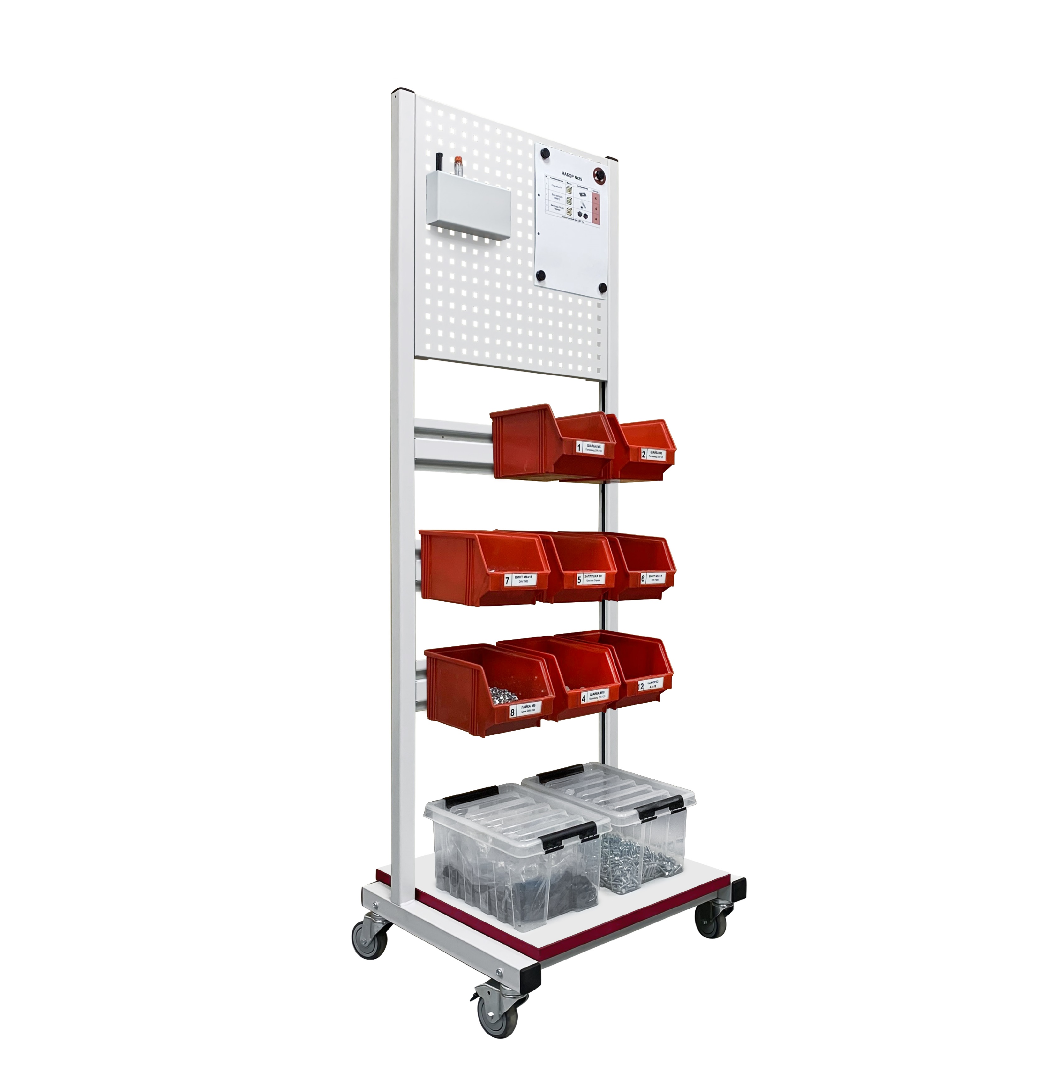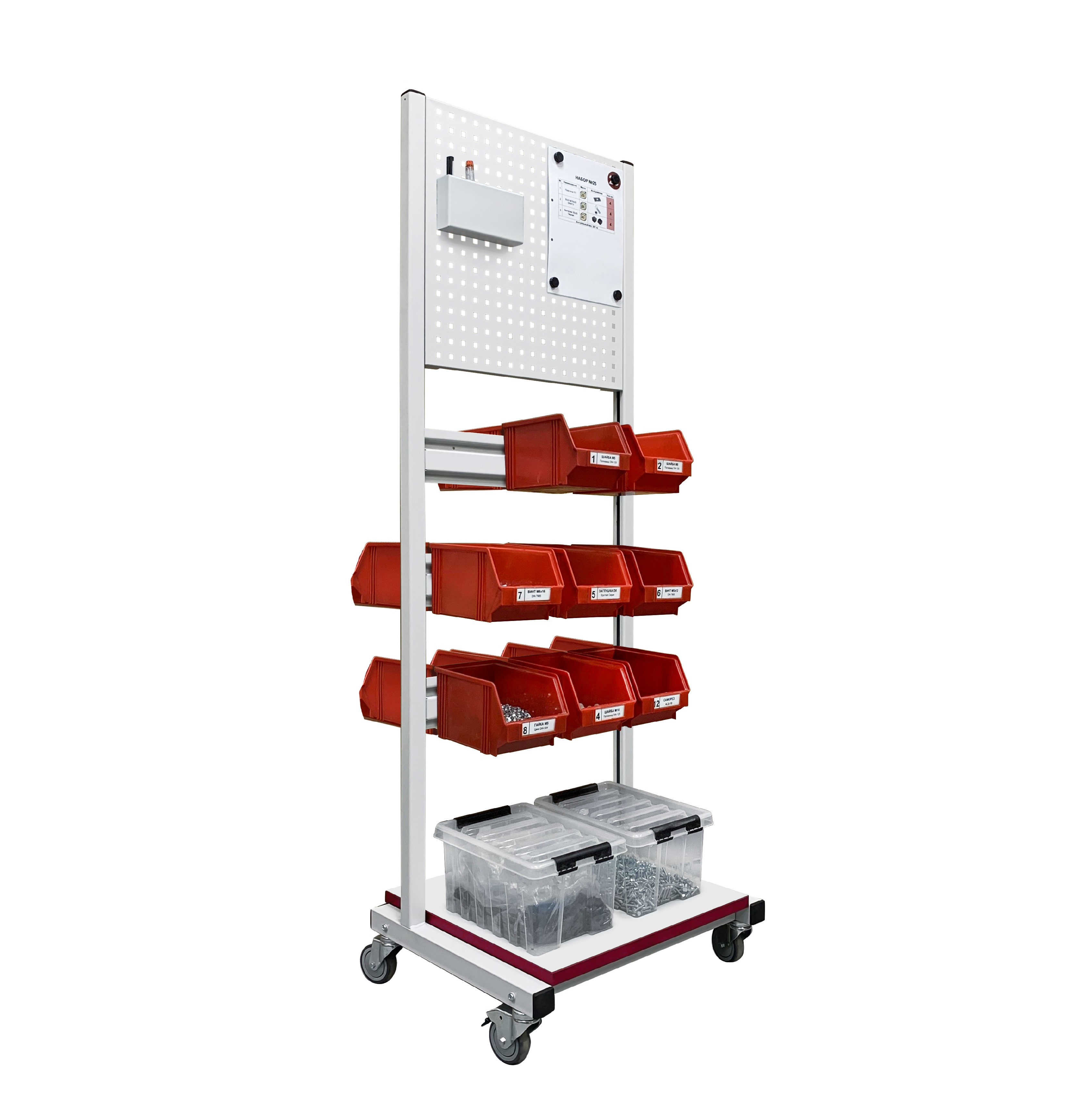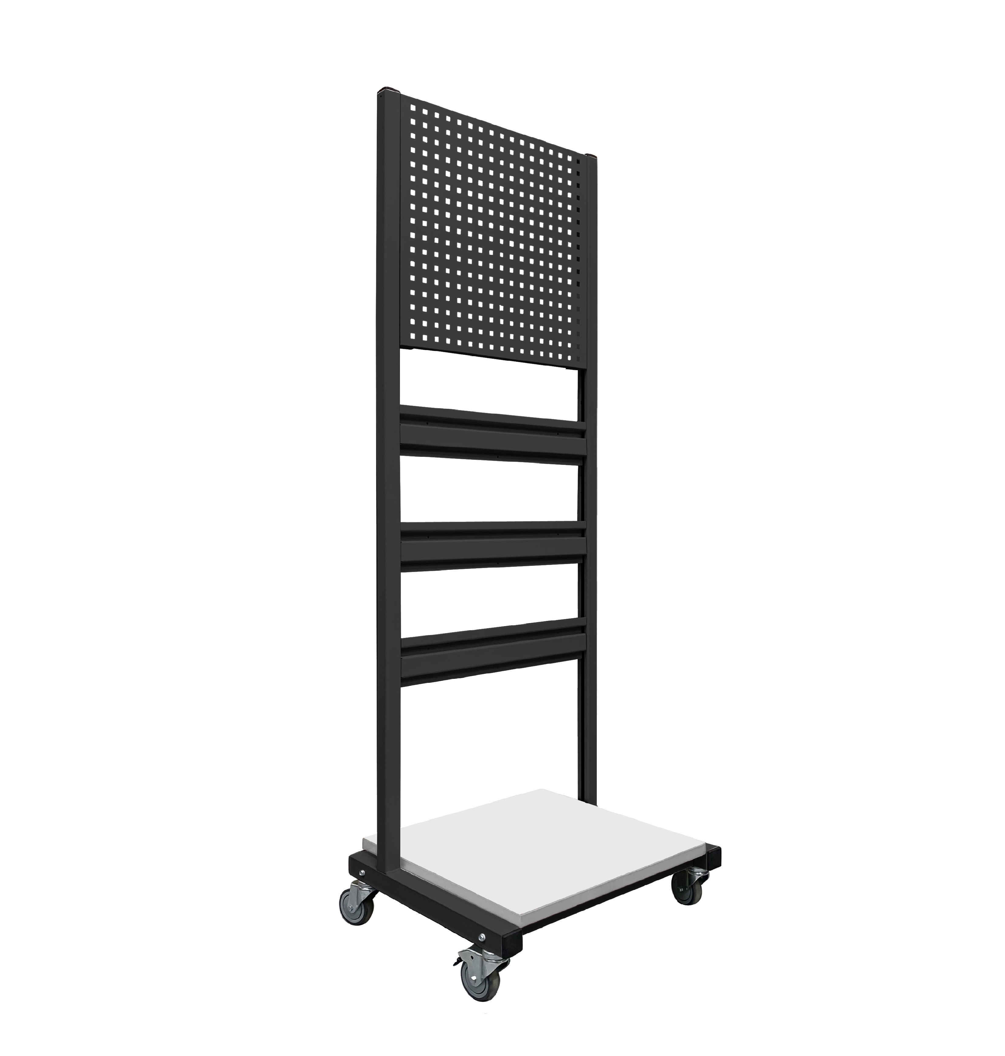 Стойка подкатная универсальная СПК используется для хранения и перемещения инструментов, материалов и комплектующих в рабочем пространстве. В стандартной комплектации стойка поставляется в комплекте с панелью перфорированной ППМ и планкой для лотков ПЛМ (3 шт.). Возможно зеркальное (двухстороннее) размещение планок для лотков и перфопанелей. Регулировка высоты дополнительного оборудования осуществляется по боковым стойкам. Конструкция стойки позволяет оснастить ее дополнительным оборудованием — полками, перфопанелями и планками для лотков. Стойка мобильная имеет металлический каркас окрашенный порошковой краской.