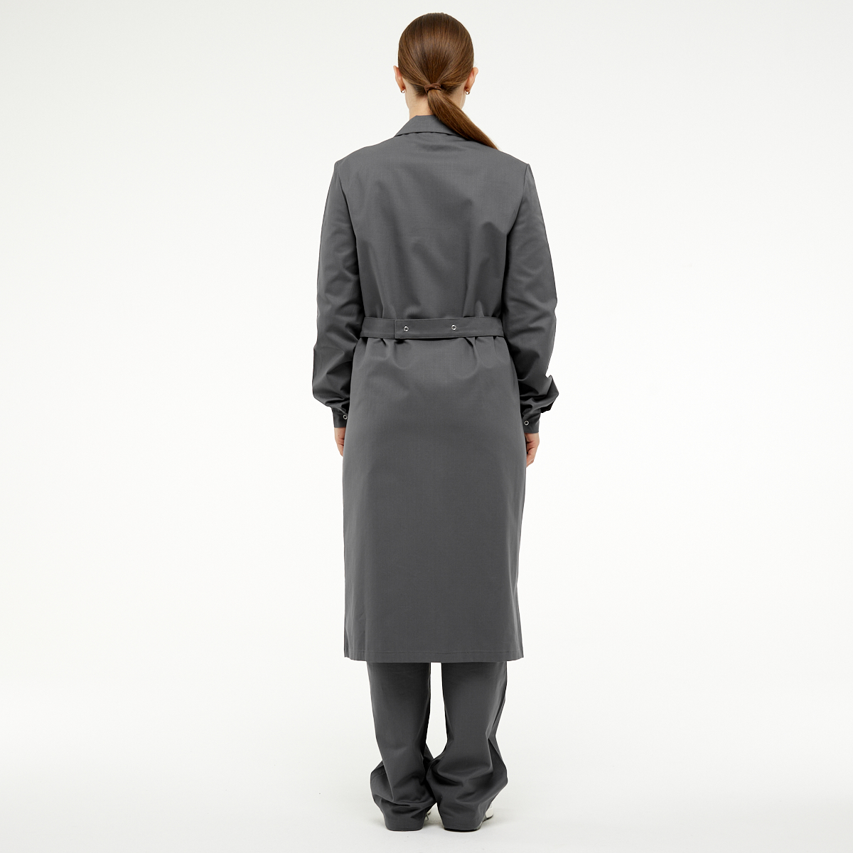 - Силуэт халата полуприлегающий, стандартной длины, с аккуратными рельефными швами, что придаёт изделию эстетическую привлекательность и улучшает посадку.